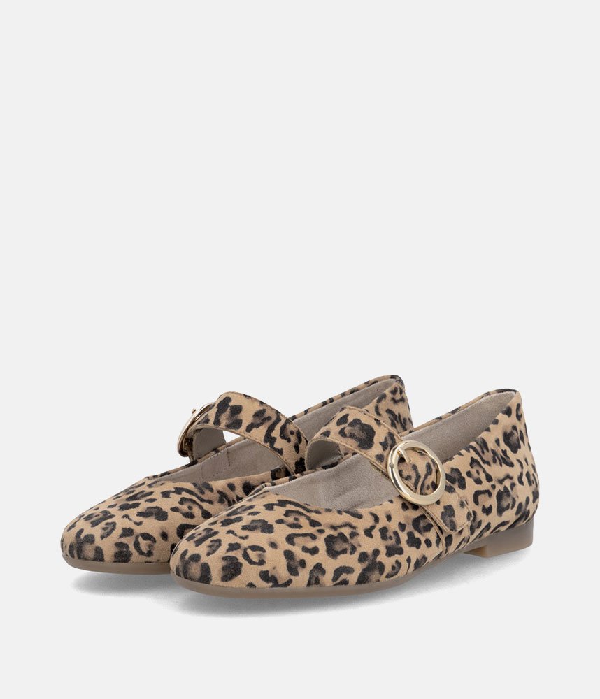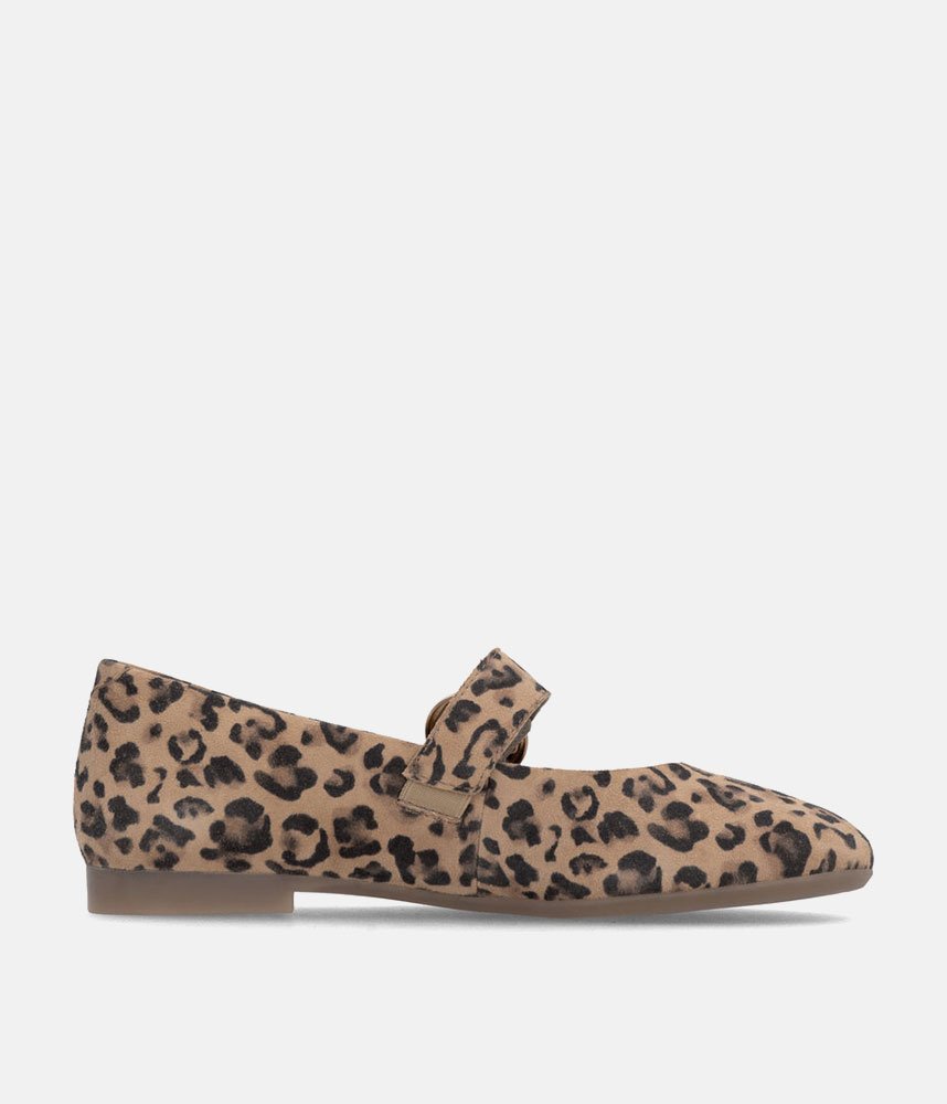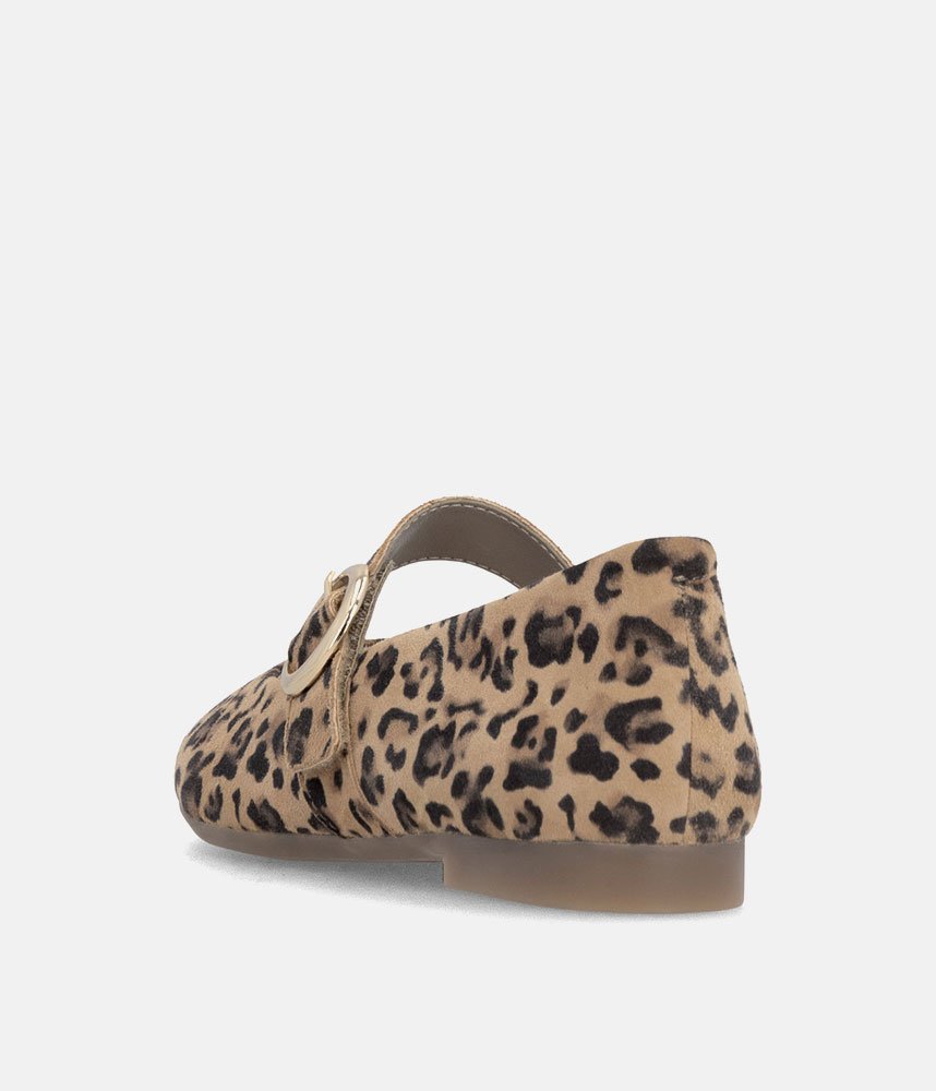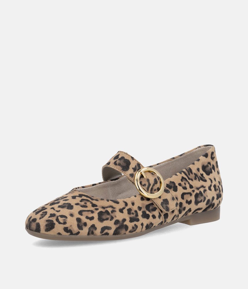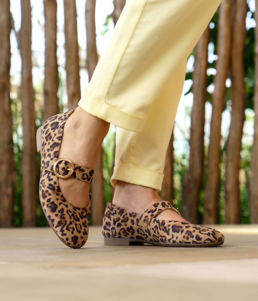 This is a Chic & Comfortable new model from Remonte with its modern take on the classic Mary Jane, featuring a comfortable flat profile and a rounded toe. Adorned with a striking, oversized gold-tone circular buckle on the instep strap for a touch of luxury. Crafted in a high-quality leopard print suede that adds texture and personality to any neutral outfit. These are the perfect statement shoe; pair them with cropped trousers or a simple black dress to let the print shine.