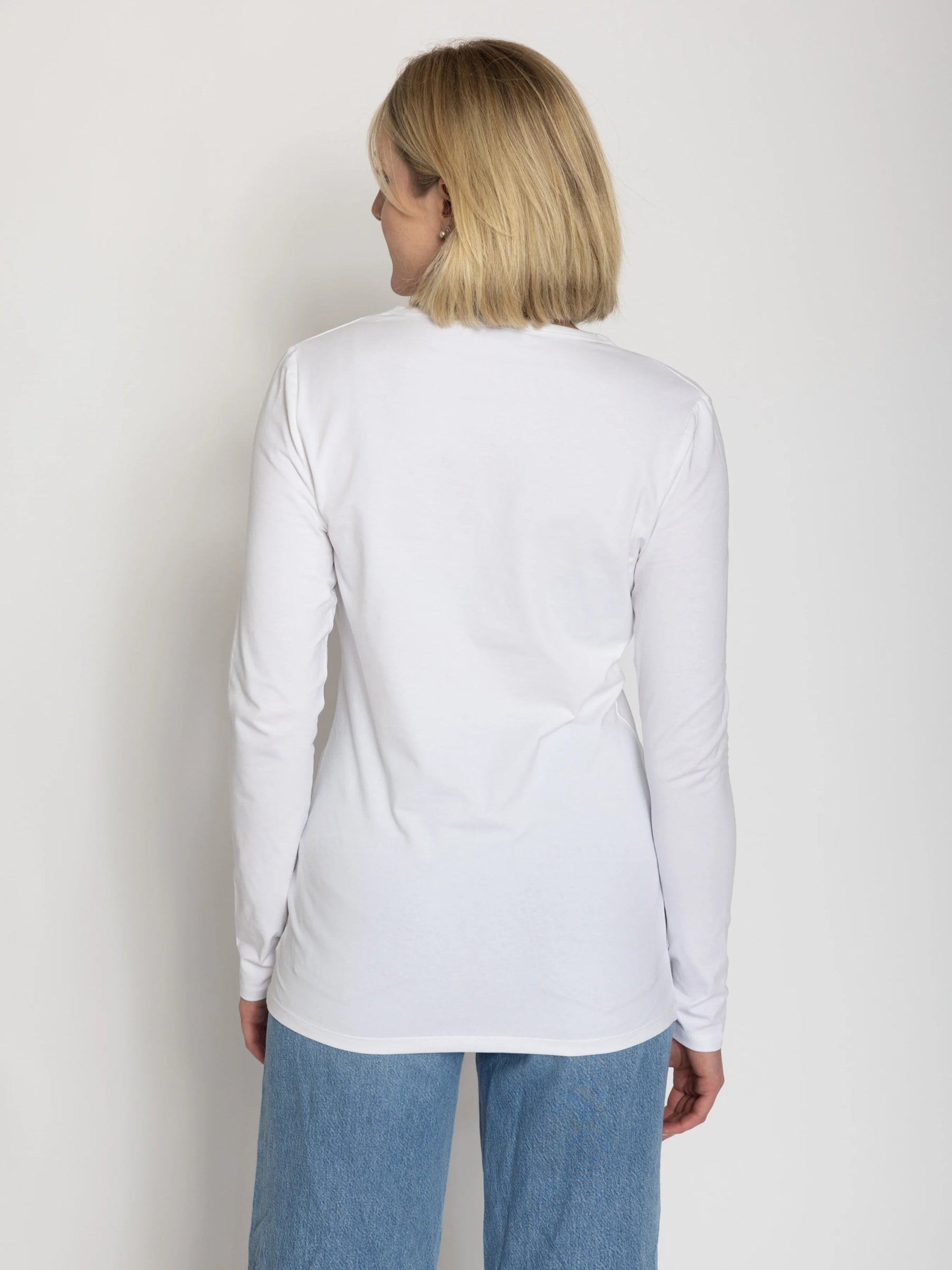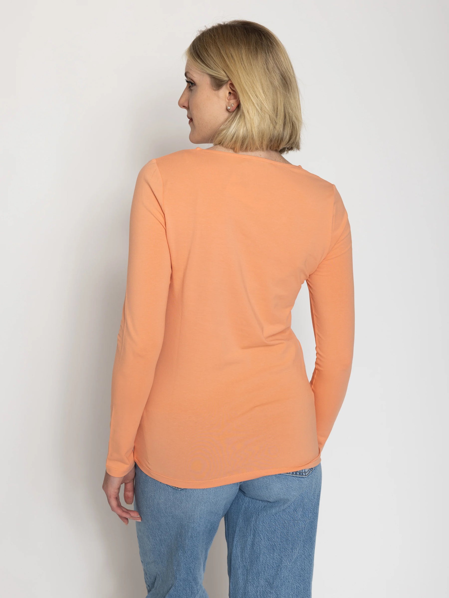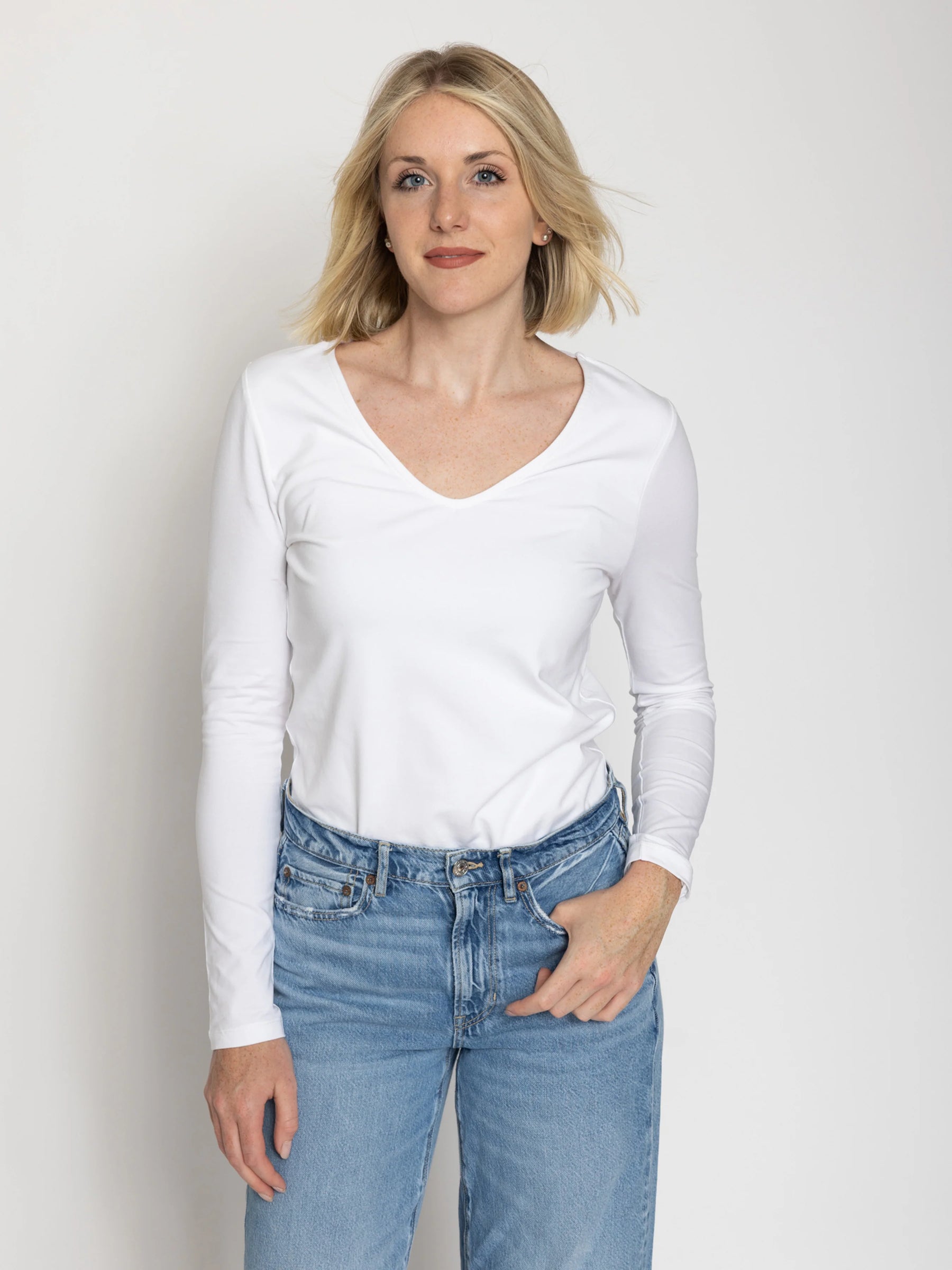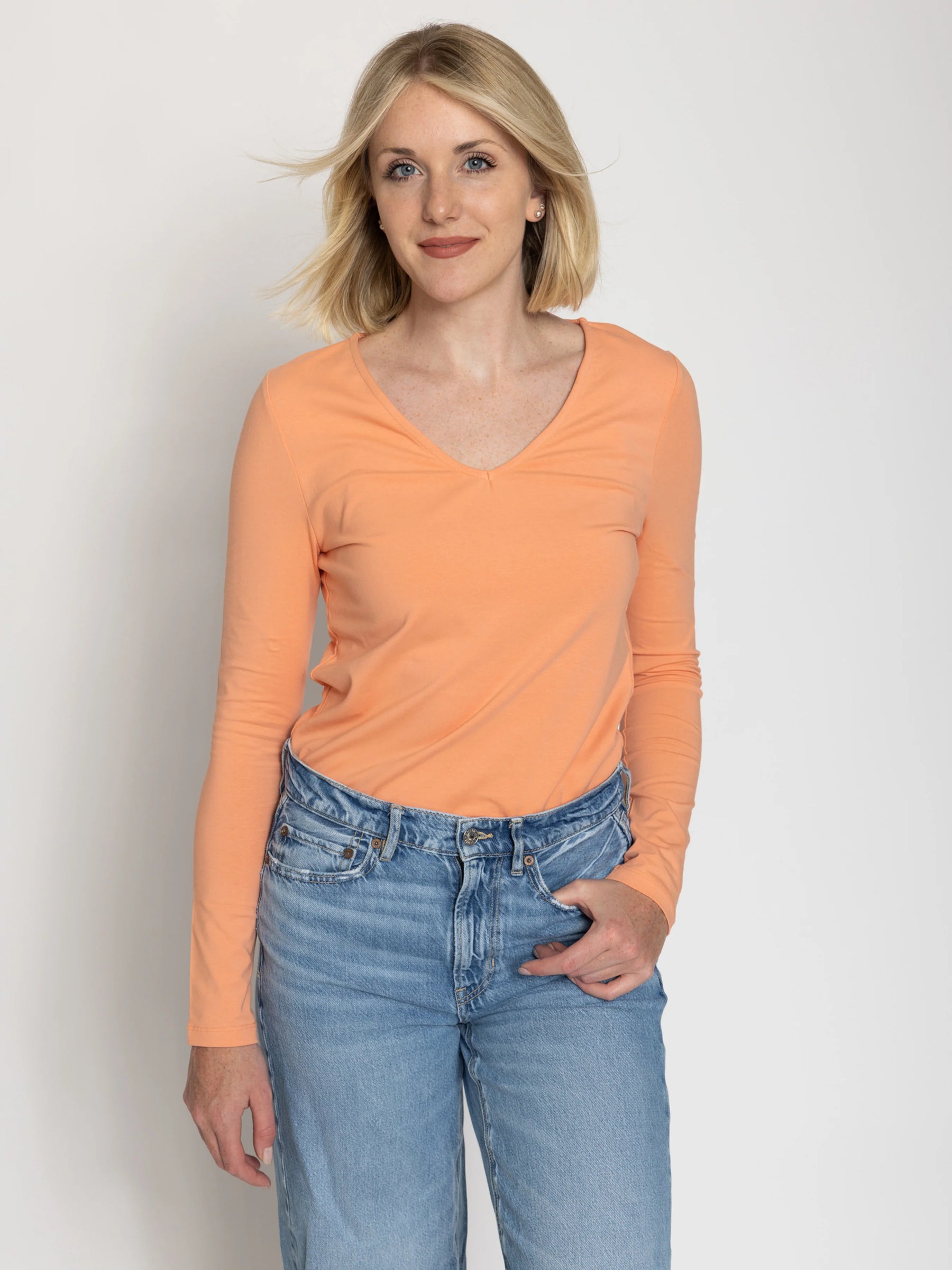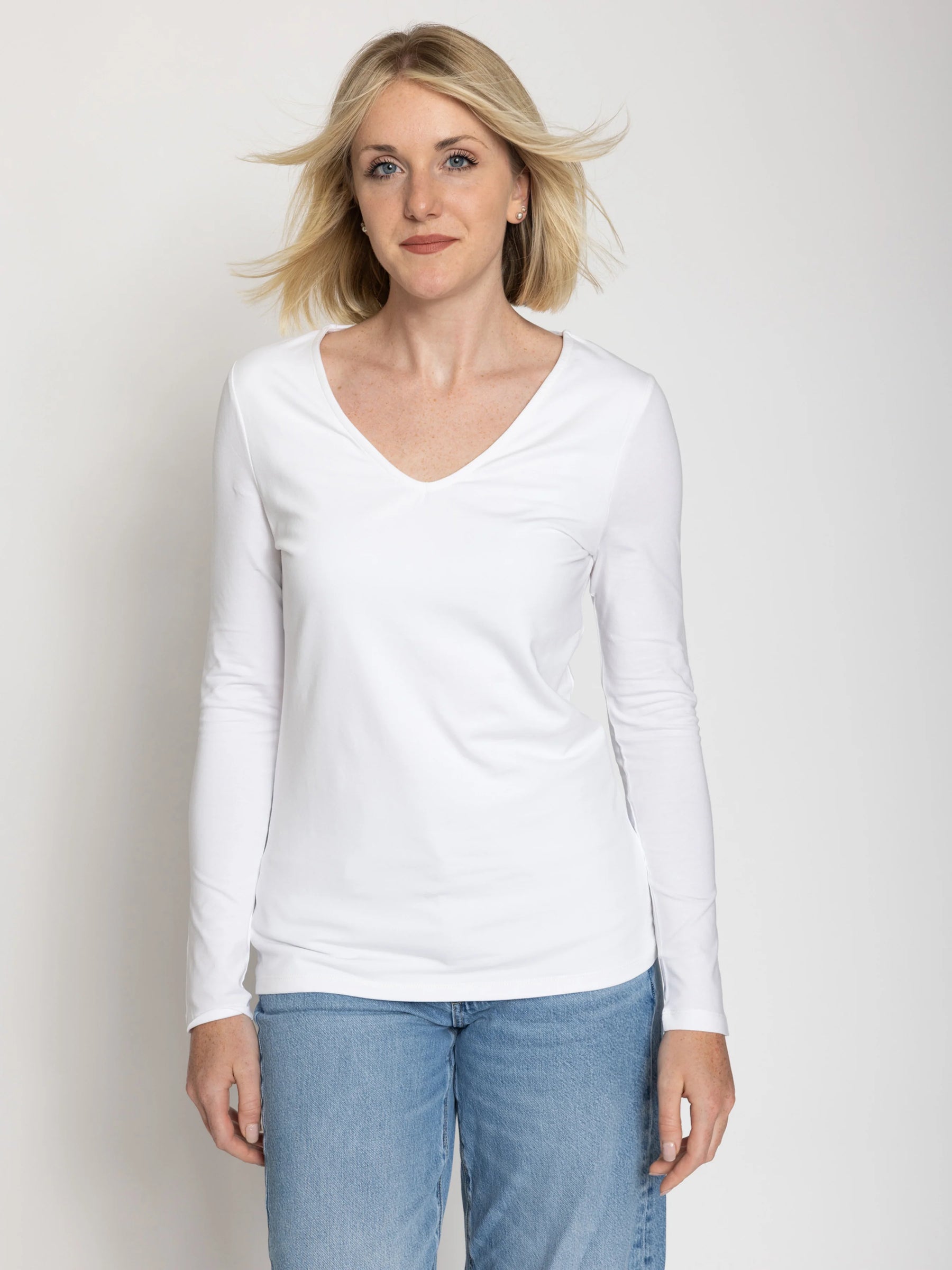 Our Tall Women’s Double Front V-Neck Long Sleeve Tee, is designed specifically for tall women who want a perfect balance of style, comfort, and fit.