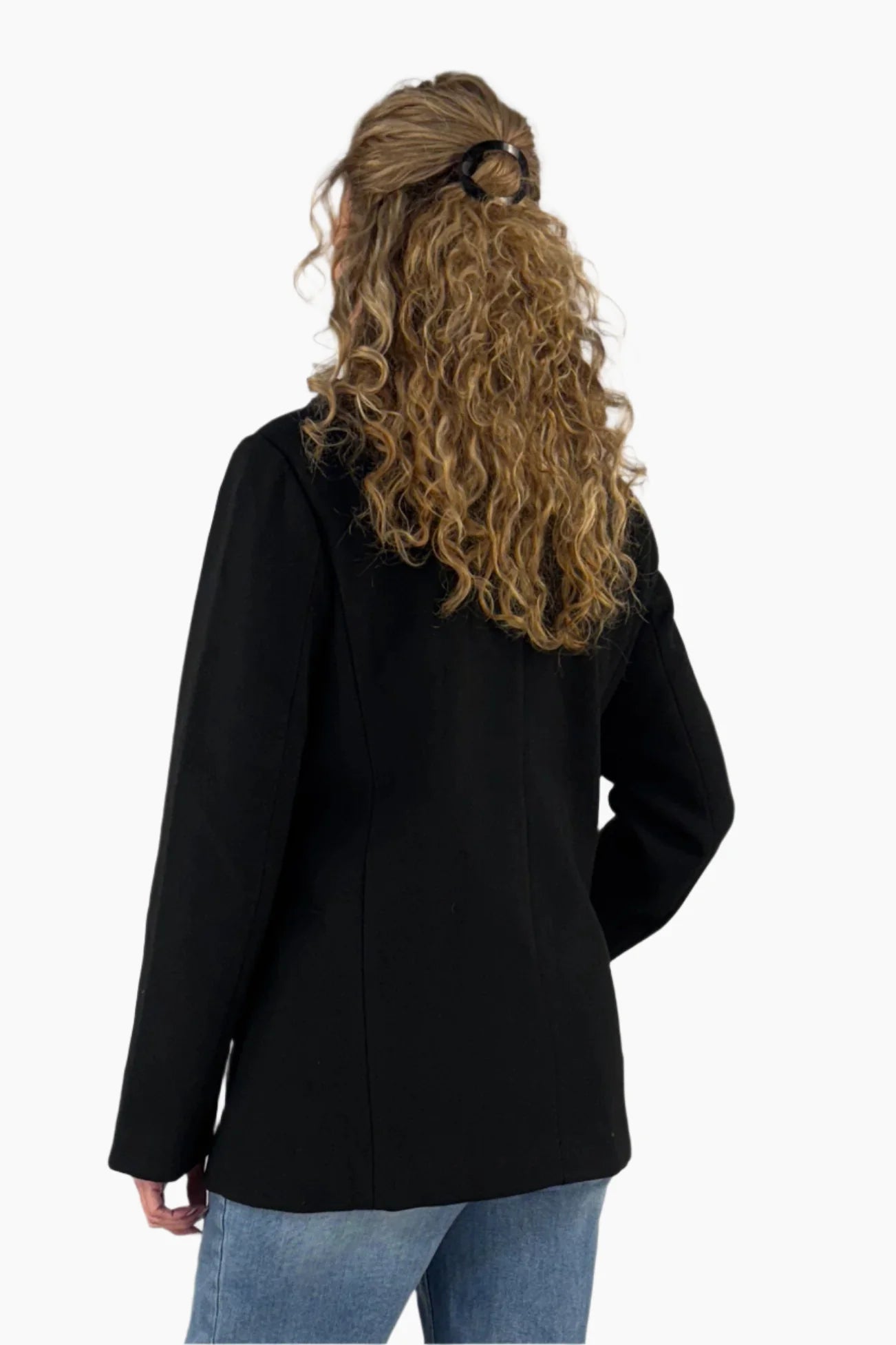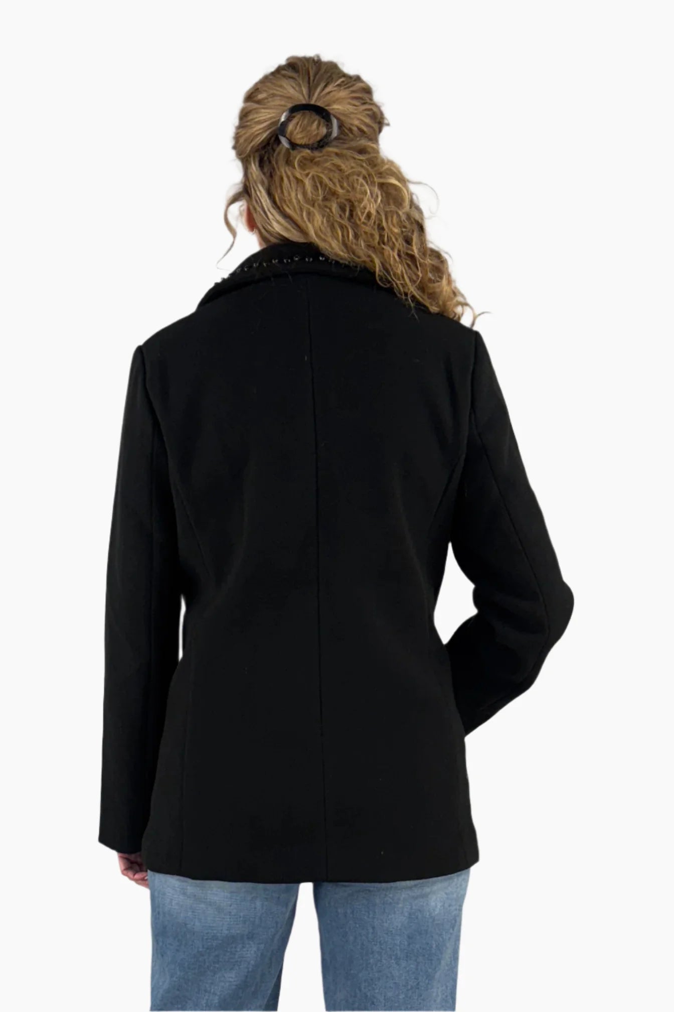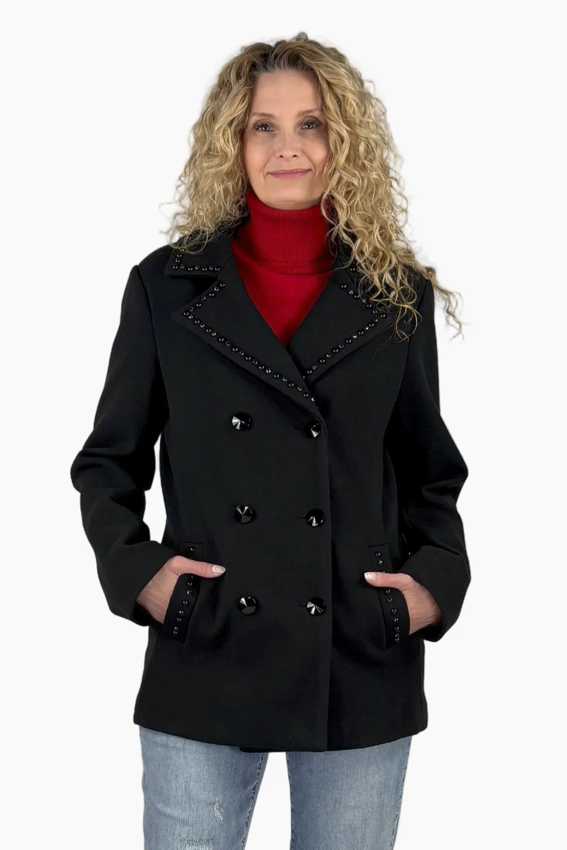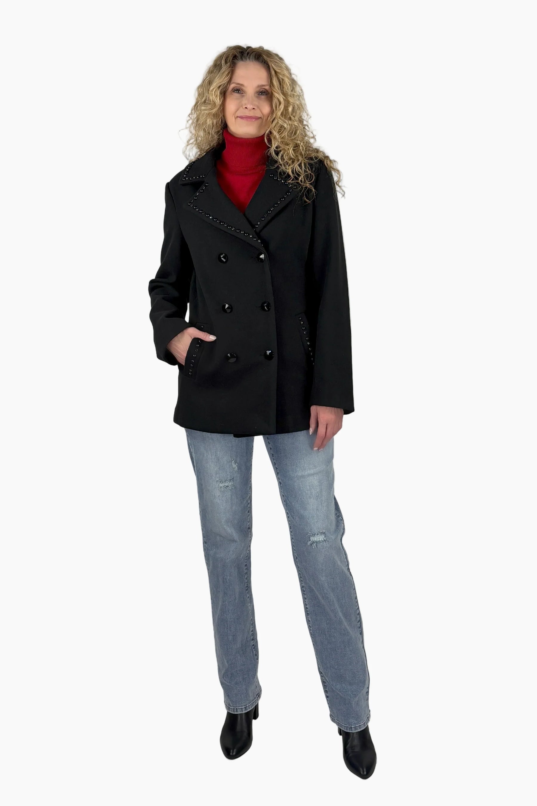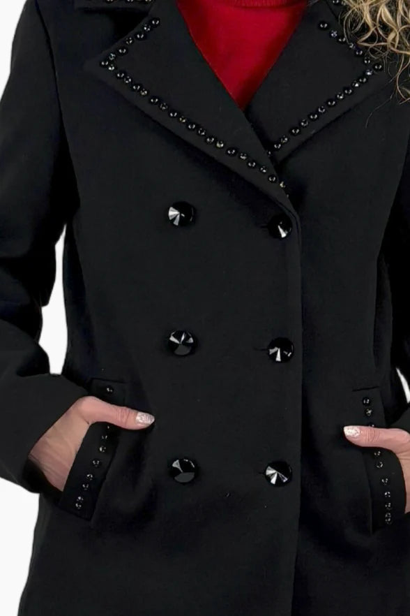 We've taken the classic peacoat and given her a modern twist. The fully lined, double breasted style features tonal, black on black embellished along the notched collar and welt pockets and topped off with dimensional buttons.