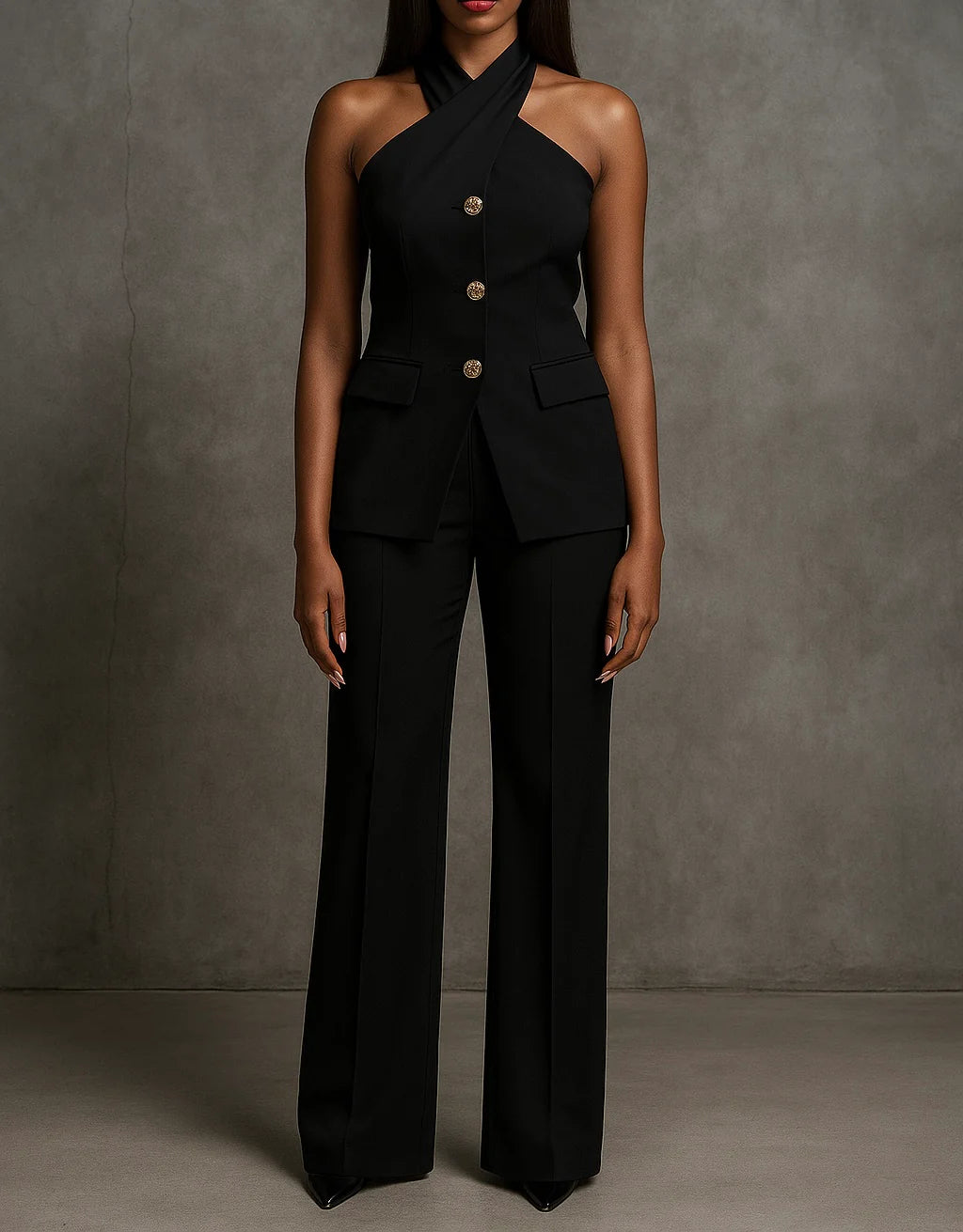 The structured halter neckline adds a contemporary twist to traditional tailoring, while gold statement buttons and flap pockets deliver timeless detail. Paired with wide-leg trousers that drape effortlessly to the floor, this set redefines what power dressing looks like for tall frames.