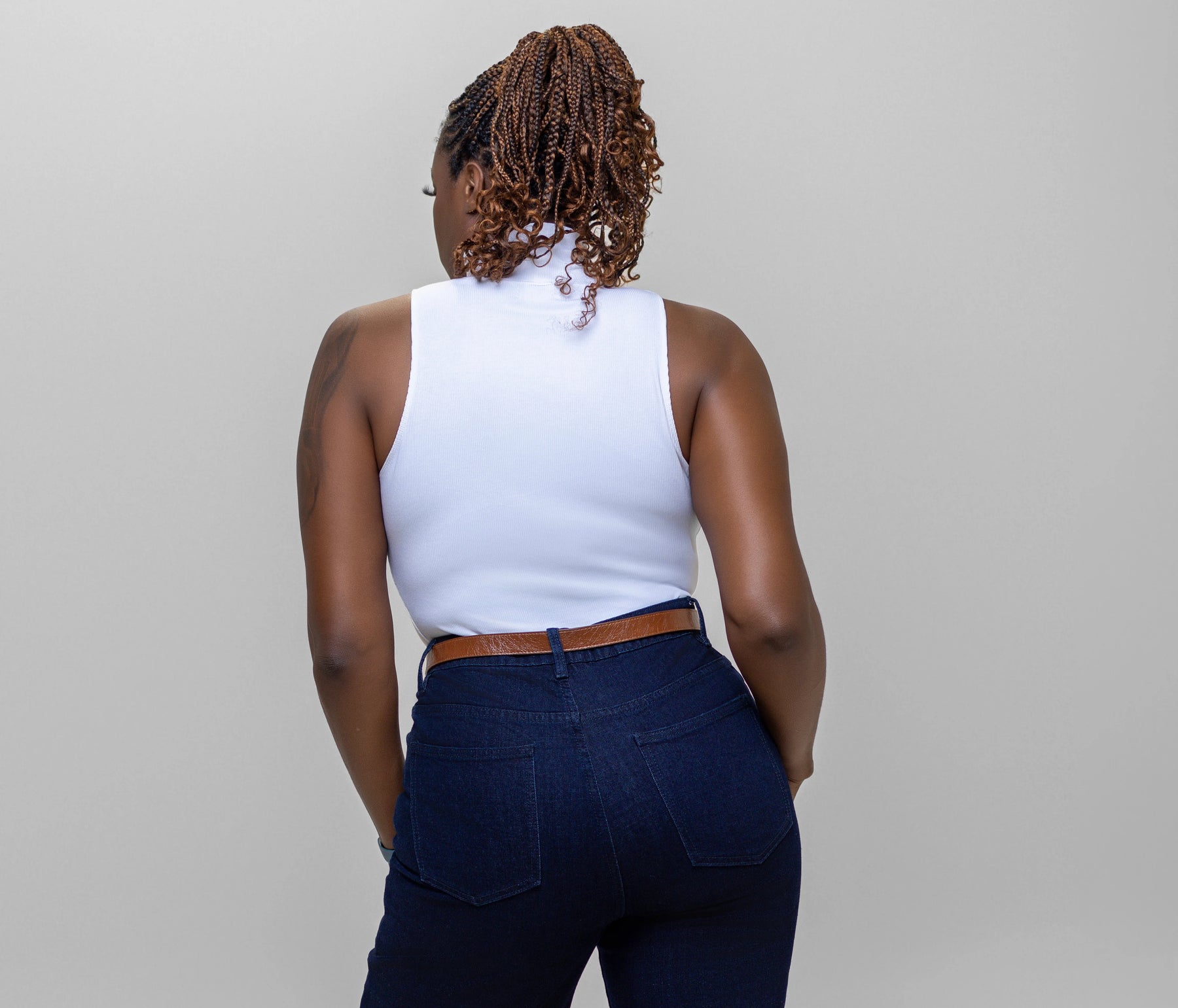 Designed with the tall woman in mind, this sleek, high-neck white bodysuit offers the perfect blend of style and comfort. Crafted with a longer torso to ensure the ideal fit, it hugs your curves while providing ample length for taller frames. The soft, stretchy fabric contours the body, making it the ultimate versatile piece for layering or wearing solo. With its minimalist design and sleeveless cut, this bodysuit is an essential staple, perfect for dressing up or down. No more tugging or uncomfortable fit—just effortless style for tall women who want to look and feel their best.