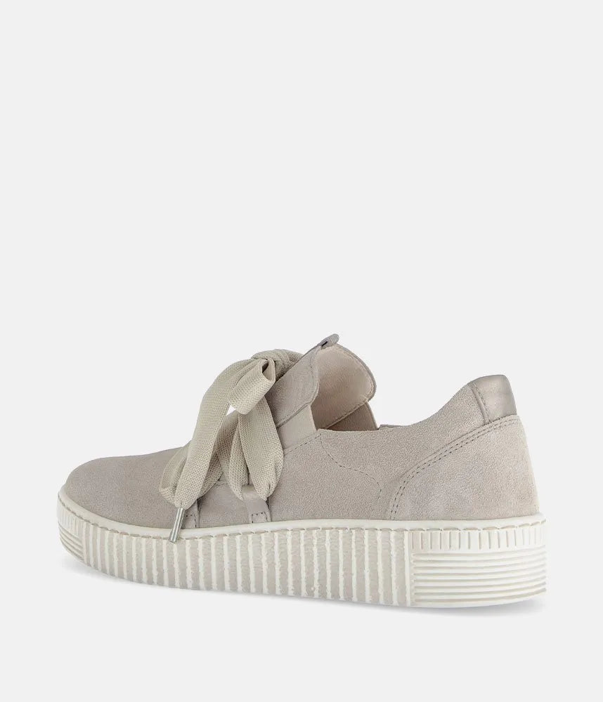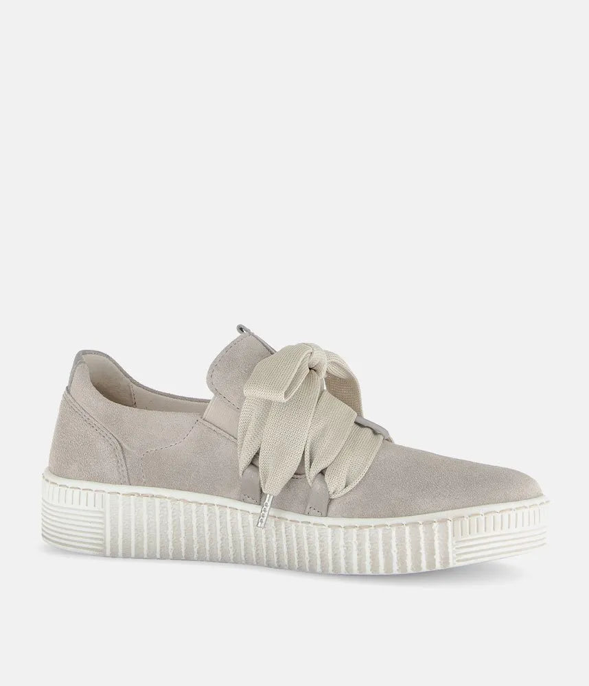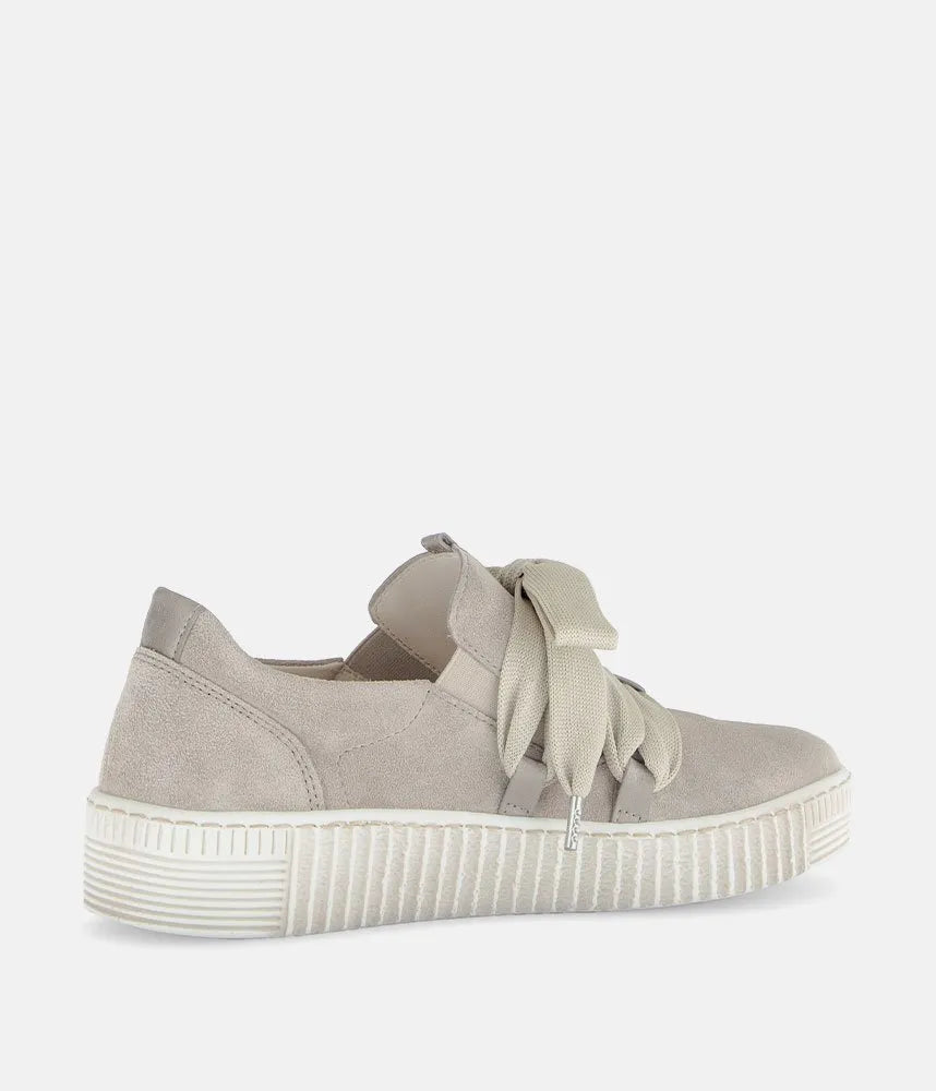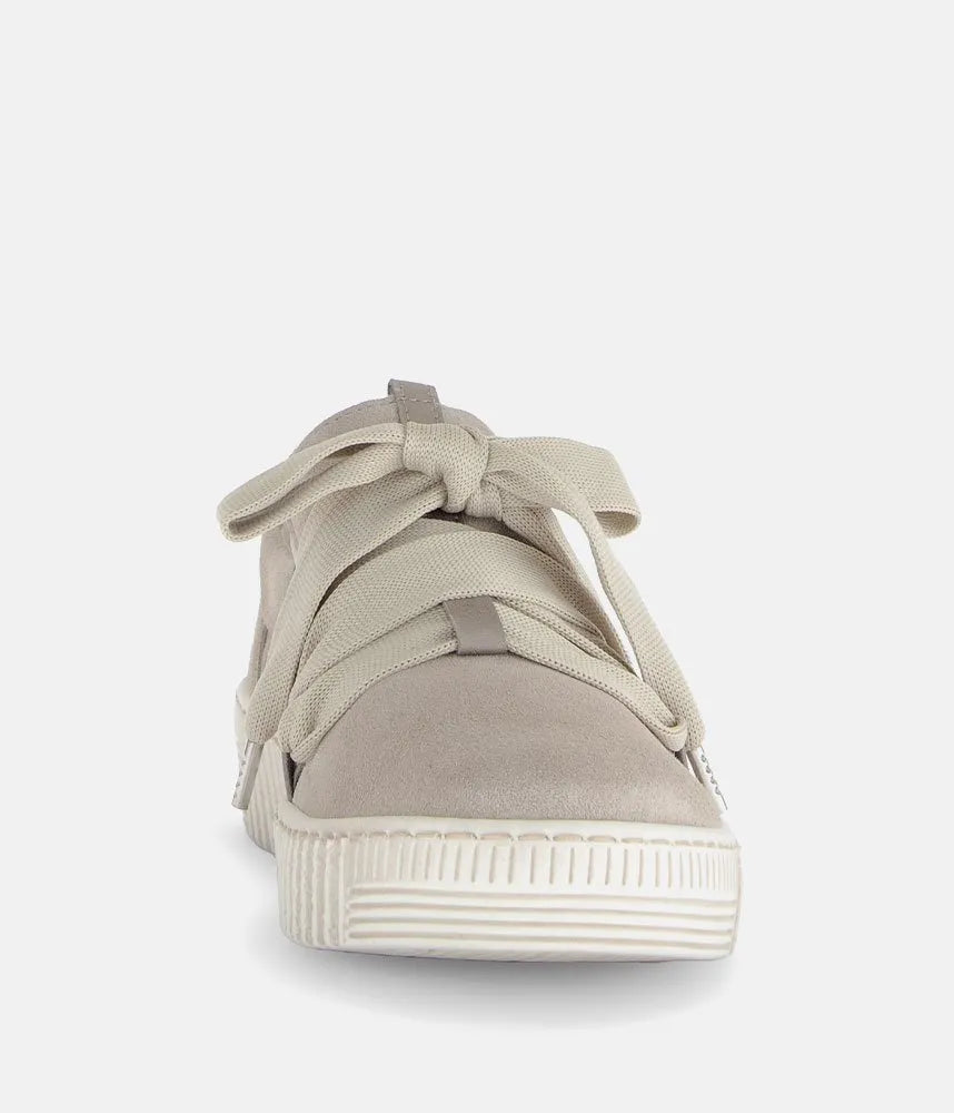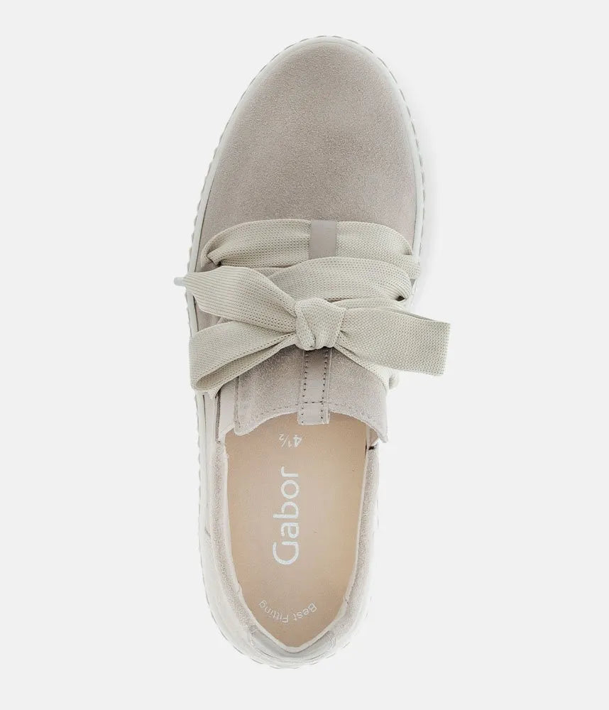 A Trendy Beige Slip on Style with pretty silk ribbon laces. The chunky outsole has stylised grooving for a textured finish. A fantastic versatile style to have in your wardrobe that can be worn with a wide variety of looks and outfits. The trainers are lined with smooth leather and textile that cushions feet for a comfortable fit.