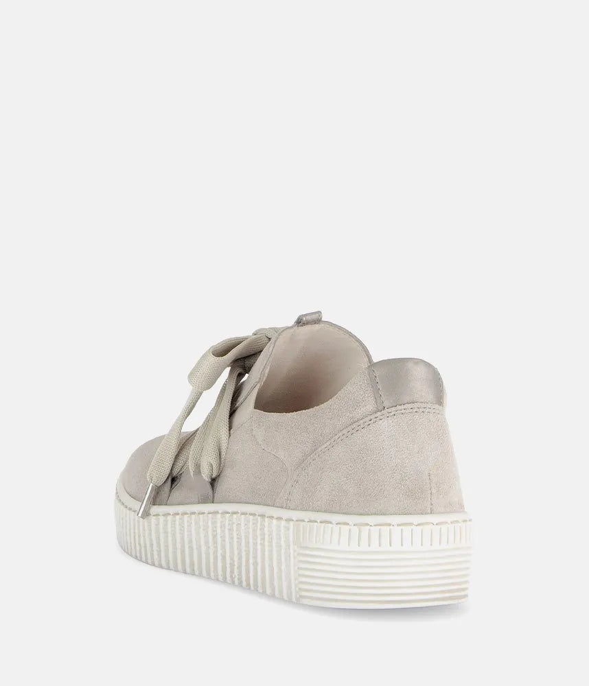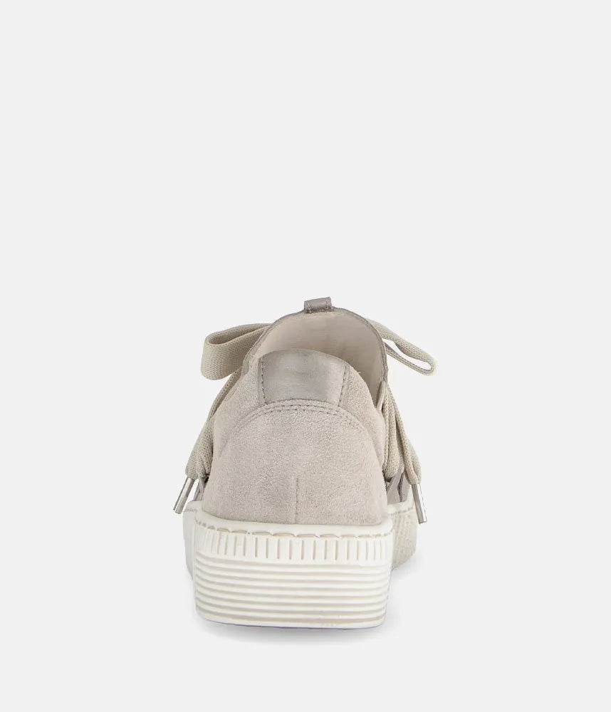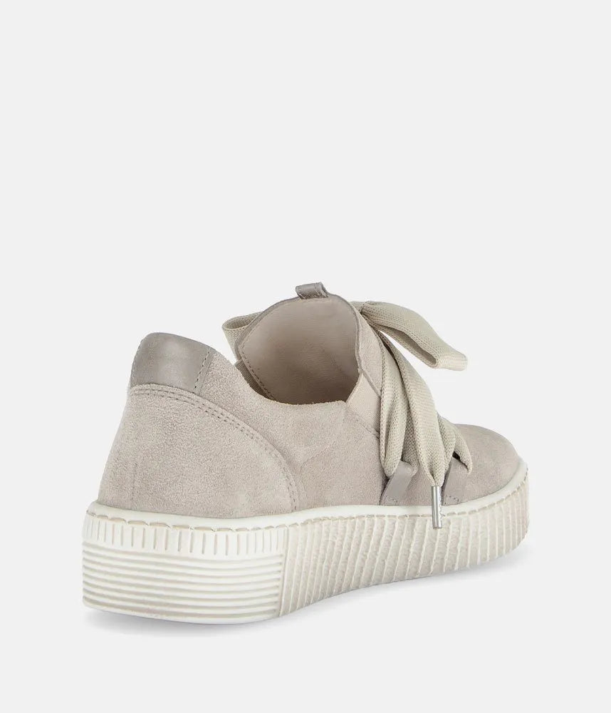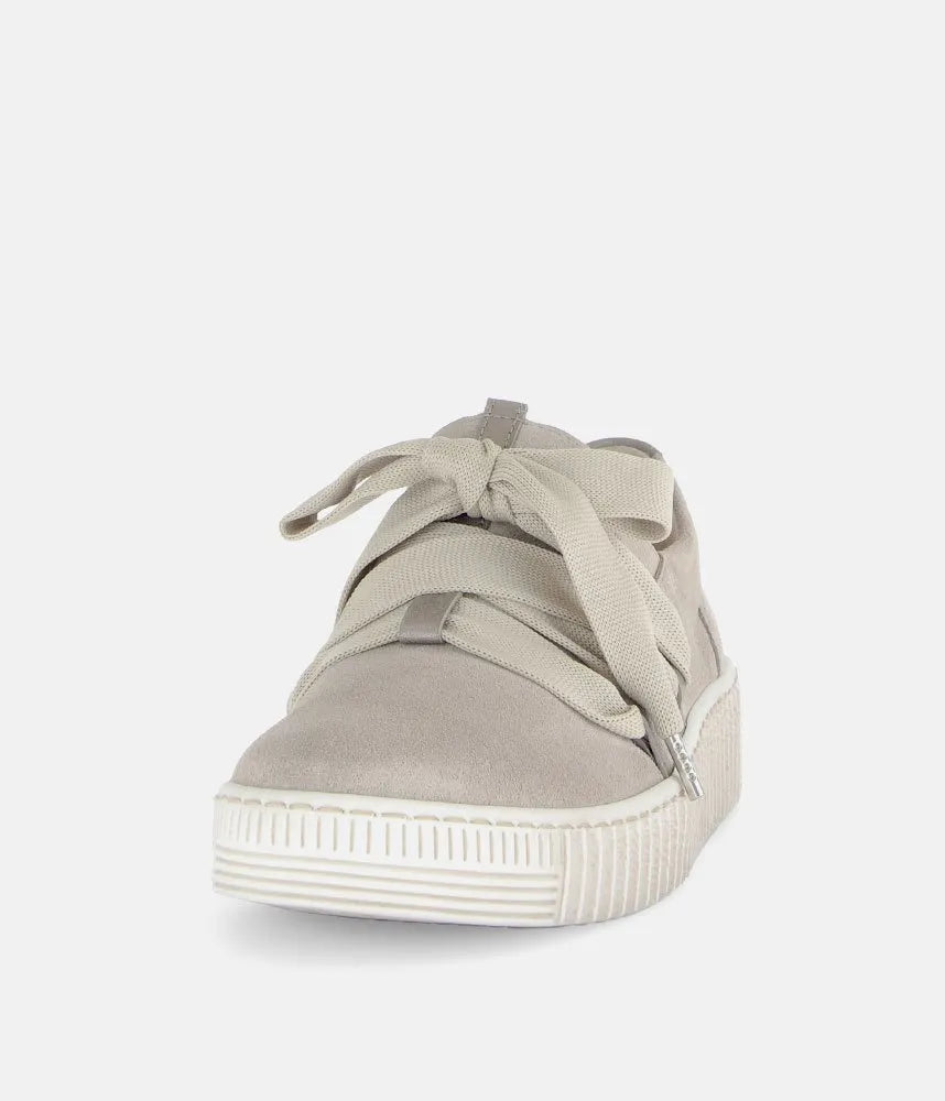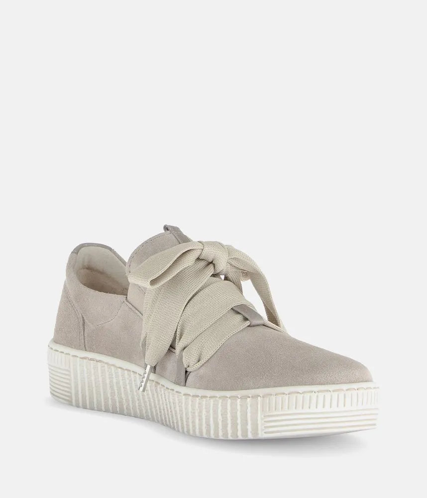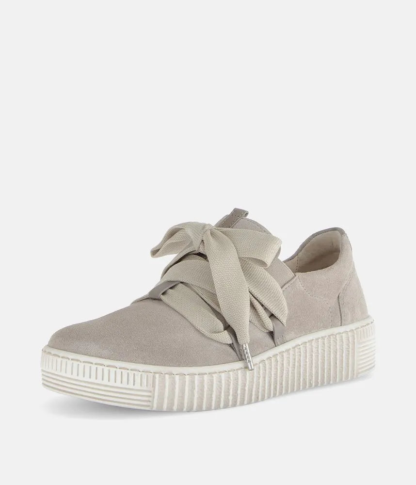 A Trendy Beige Slip on Style with pretty silk ribbon laces. The chunky outsole has stylised grooving for a textured finish. A fantastic versatile style to have in your wardrobe that can be worn with a wide variety of looks and outfits. The trainers are lined with smooth leather and textile that cushions feet for a comfortable fit.