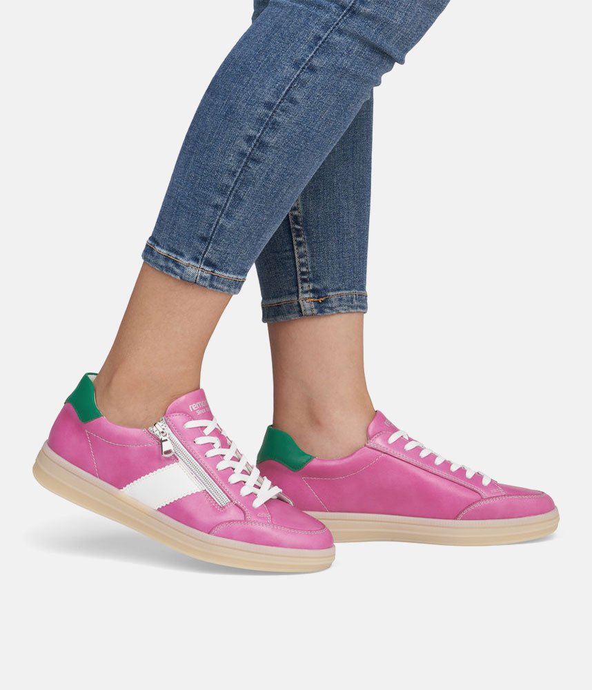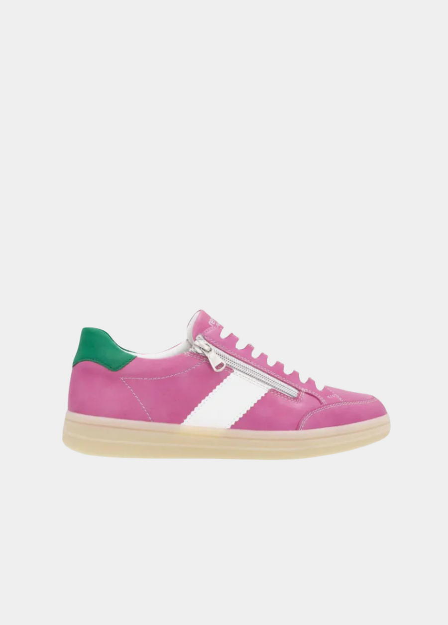 Introducing this New signature style from Liz Hurley; made in a beautiful combination of Pink, Green cuff, and White panel and laces. Crafted with a leather upper and textile lining, these trainers offer exceptional comfort and style. A cushioned and removable soft insole provides optimal comfort and molds to the contours of your foot. The laces allow for an adjustable fit and the side zip makes it easy to slip on and off. Whether you’re dressing up your favorite jeans or adding a pop of color to a casual outfit, these shoes are sure to elevate your look effortlessly. Step out in style with this chic and versatile footwear!