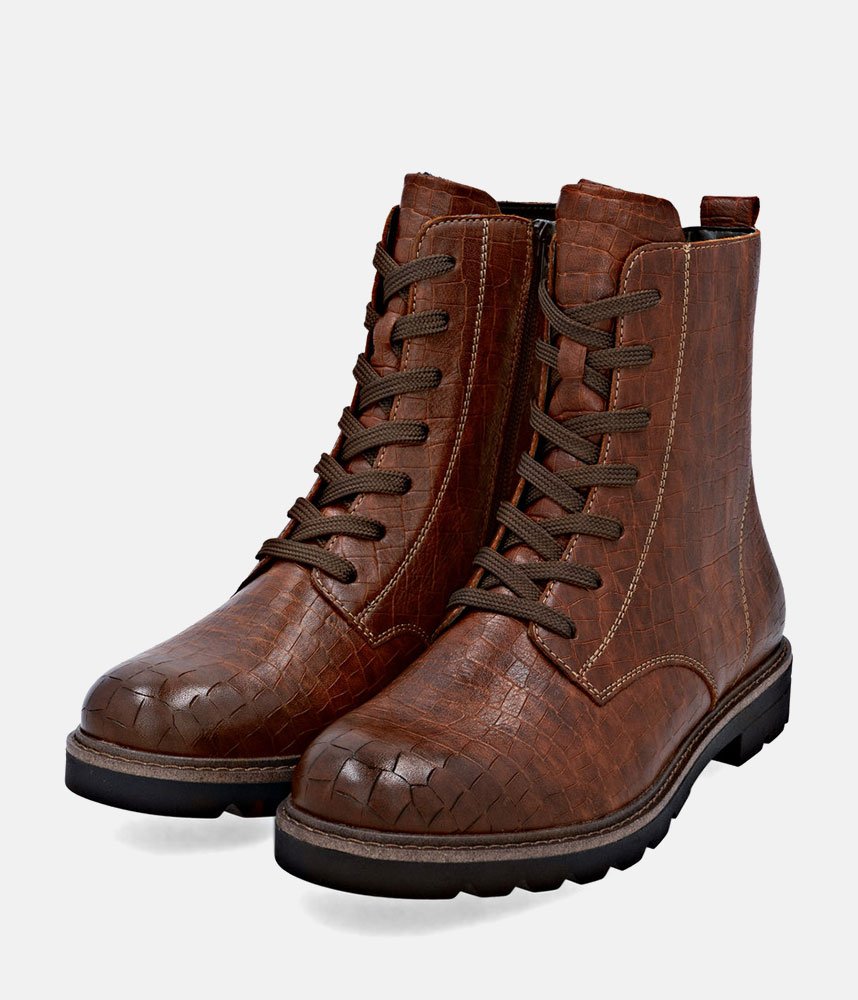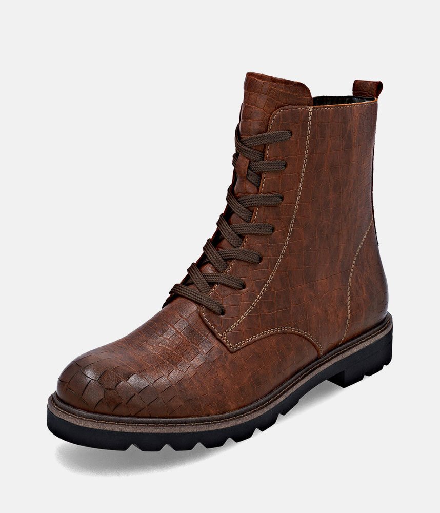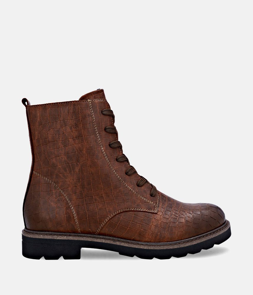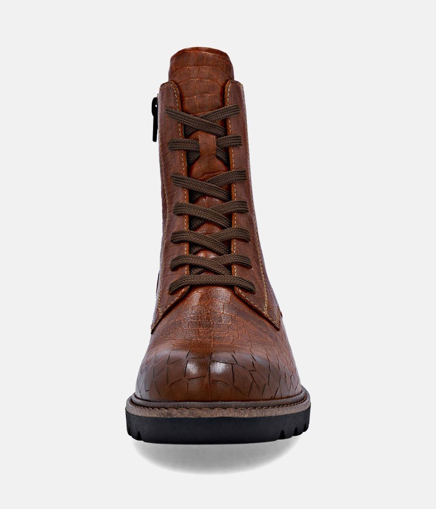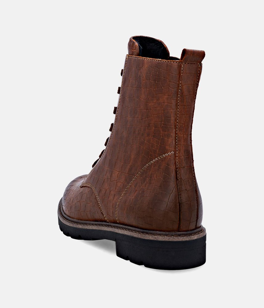 This is great new season ankle boot from a distinctive crocodile-embossed leather upper. The rich brown finish and intricate texture provide a sophisticated and luxurious look, while the classic lace-up design offers a secure and adjustable fit. A side zipper allows for easy on and off, and the sturdy lug sole provides excellent traction and durability.