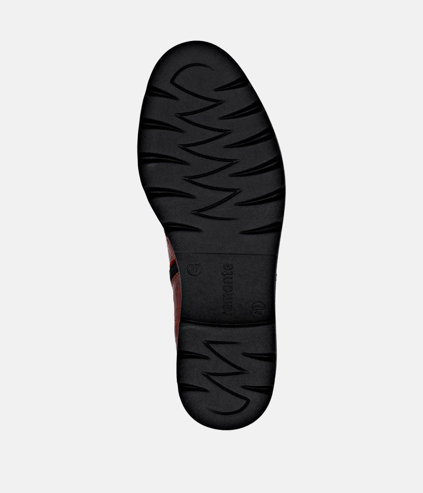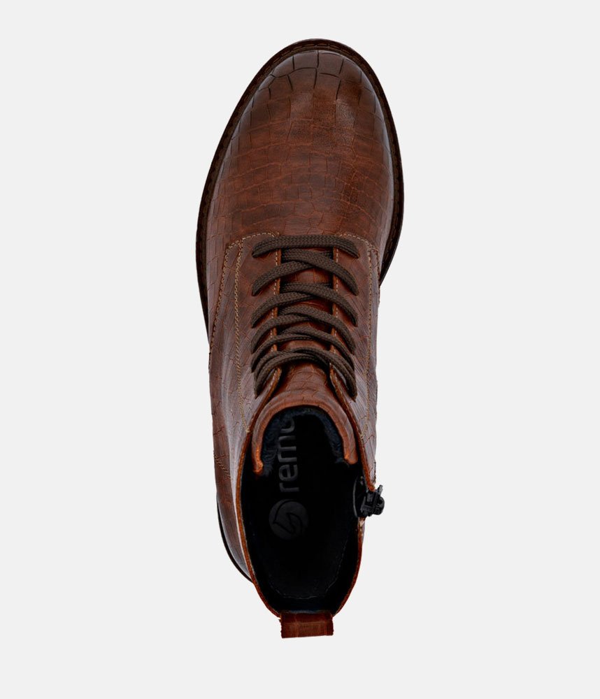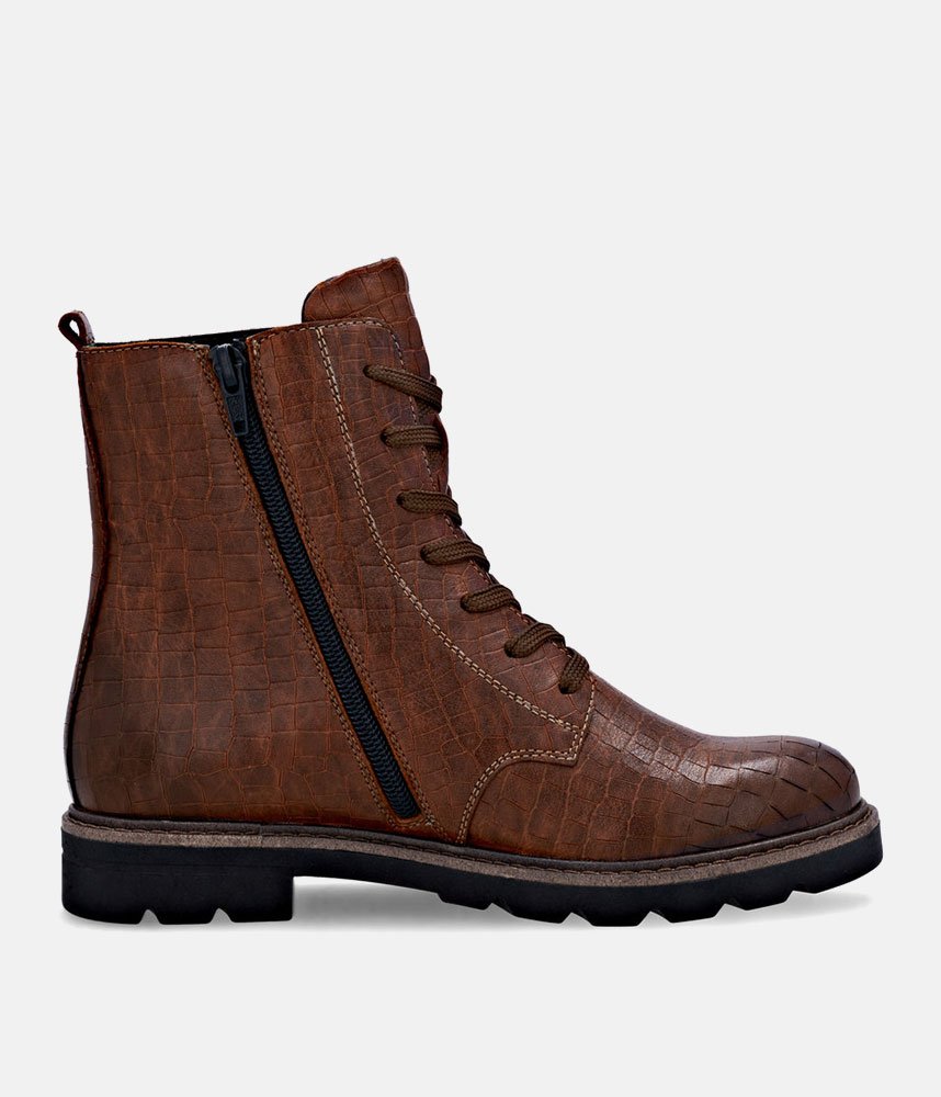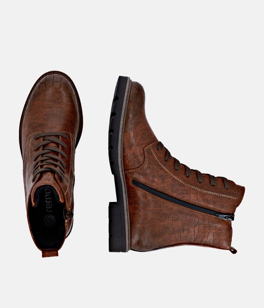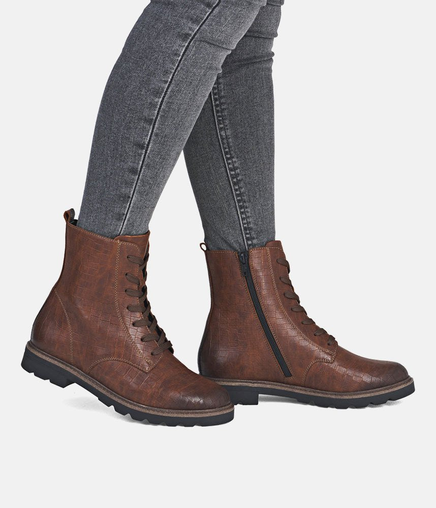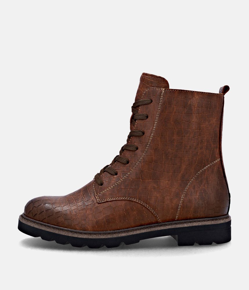 This is great new season ankle boot from a distinctive crocodile-embossed leather upper. The rich brown finish and intricate texture provide a sophisticated and luxurious look, while the classic lace-up design offers a secure and adjustable fit. A side zipper allows for easy on and off, and the sturdy lug sole provides excellent traction and durability.