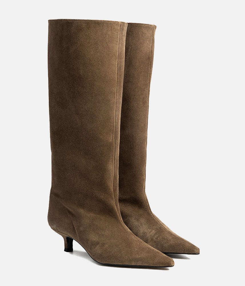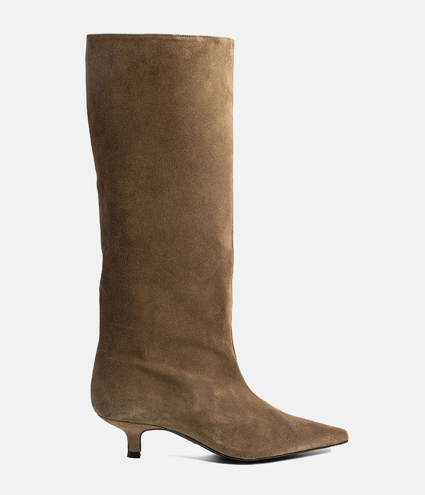 Step out in style with our on-trend knee high boots for the new season. These stunning brown suede boots feature a clean, minimalist design that makes them incredibly versatile. The pointed toe and graceful kitten heel create a refined silhouette. Whether you're dressing them up with a dress or skirt, or wearing them with your favorite skinny jeans, these boots are a chic and comfortable choice for a variety of occasions.