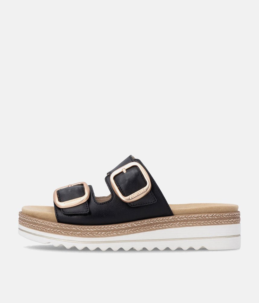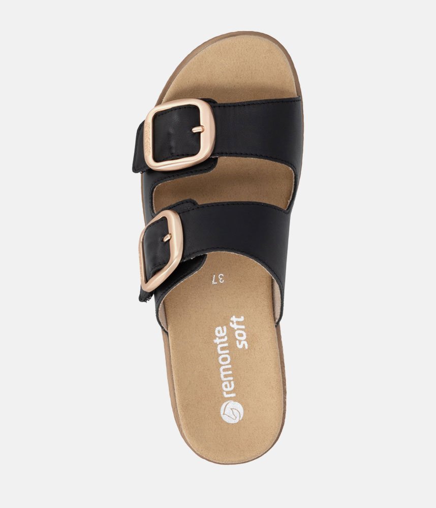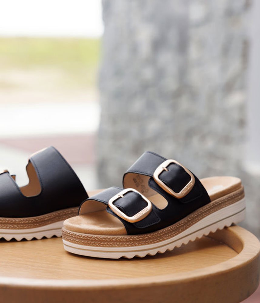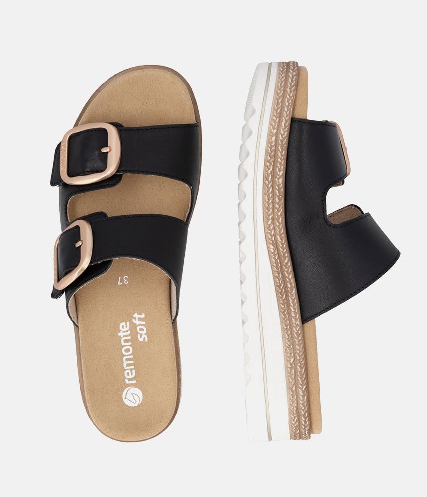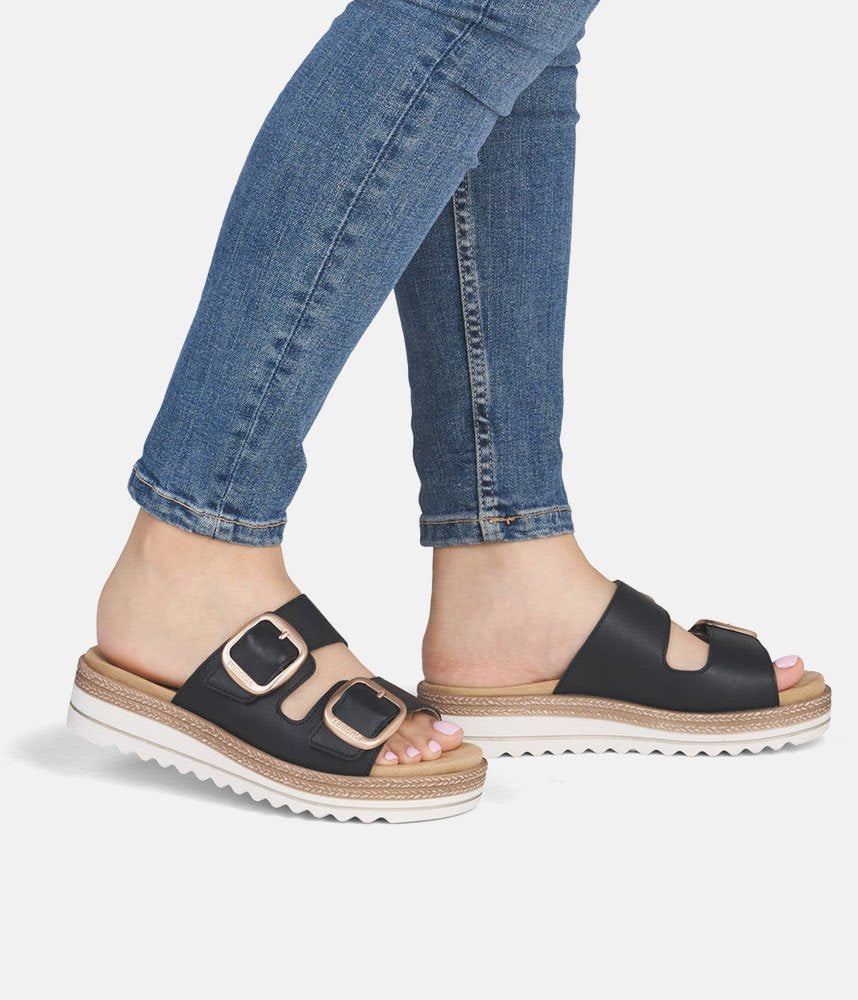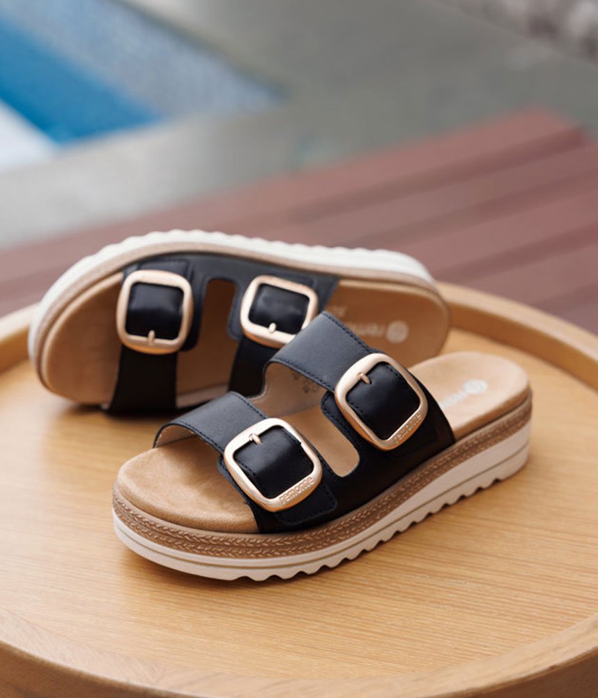 Looking for the perfect "go with everything" sandal? You just found it. These Remonte Soft slides combine a sleek black upper with stunning oversized gold-tone buckles for a look that’s effortlessly chic. The contoured, cushioned footbed makes these a dream to walk in, while the chunky sole adds height without the foot pain.