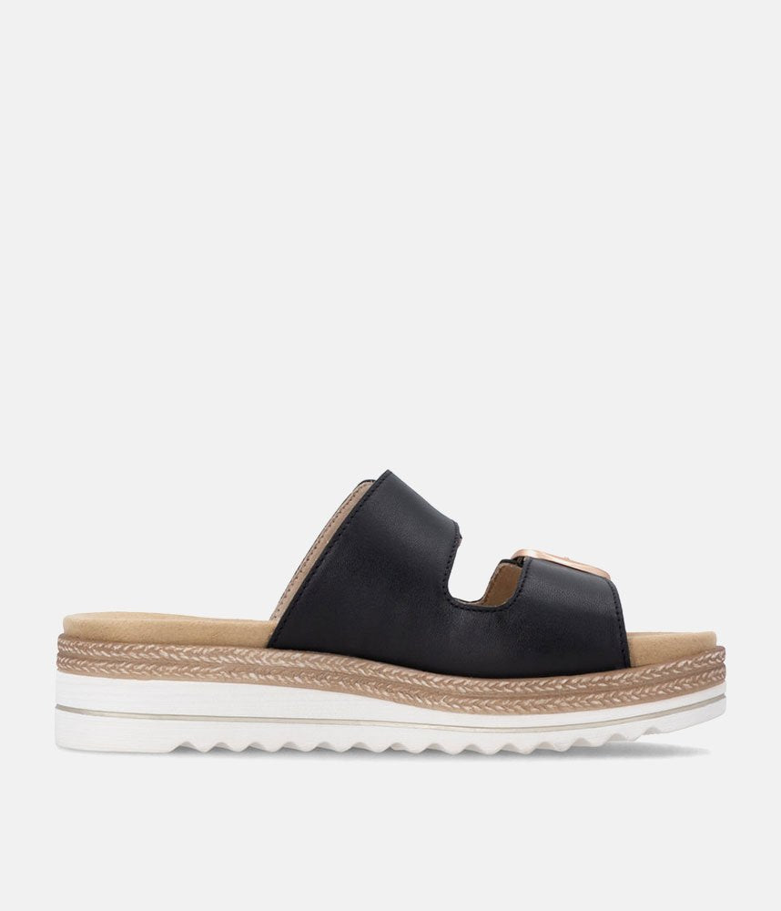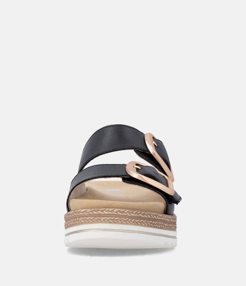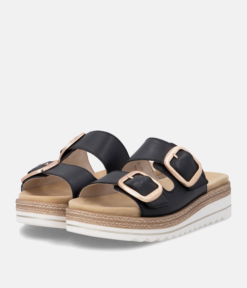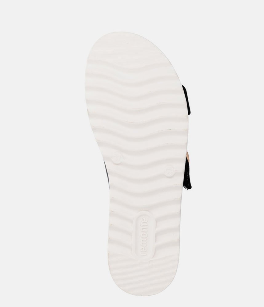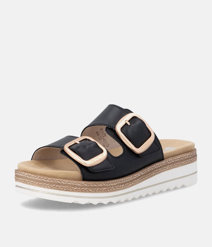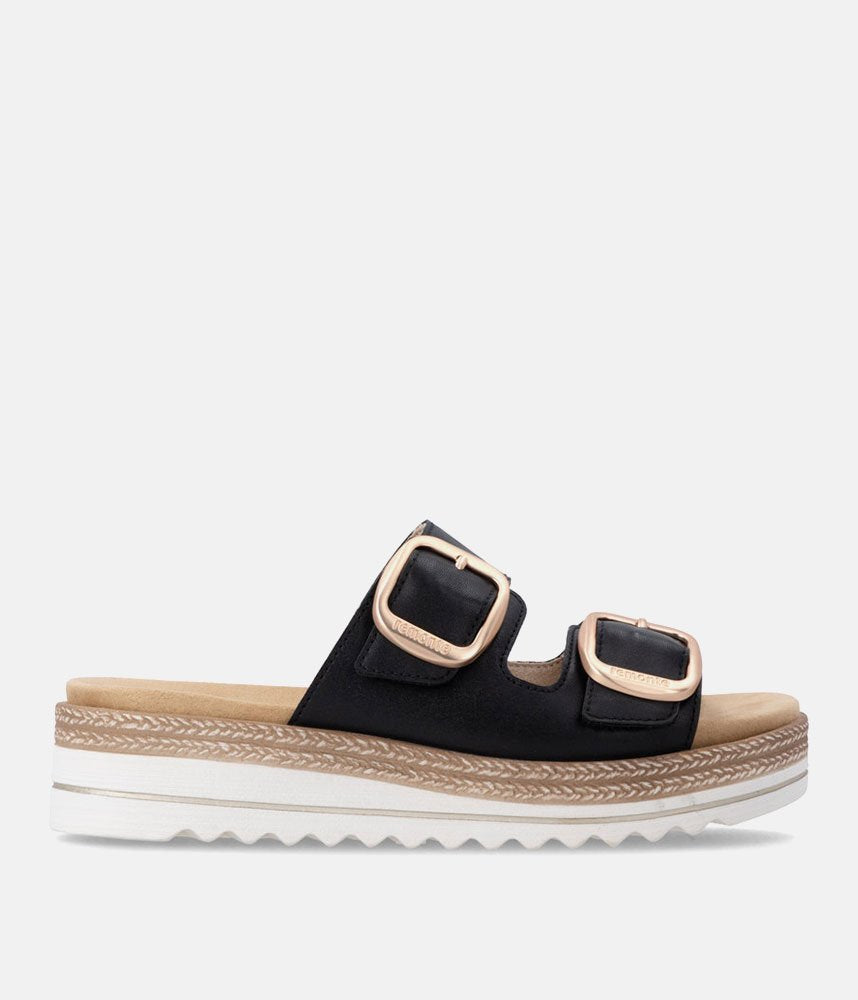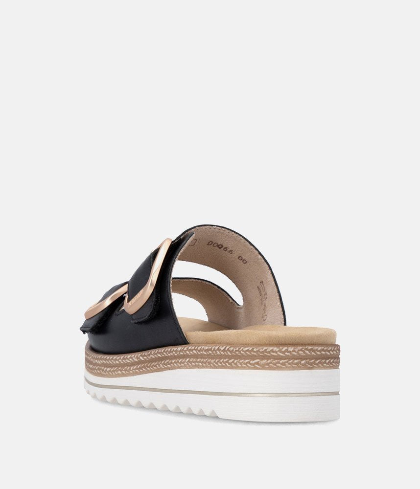 Looking for the perfect "go with everything" sandal? You just found it. These Remonte Soft slides combine a sleek black upper with stunning oversized gold-tone buckles for a look that’s effortlessly chic. The contoured, cushioned footbed makes these a dream to walk in, while the chunky sole adds height without the foot pain.