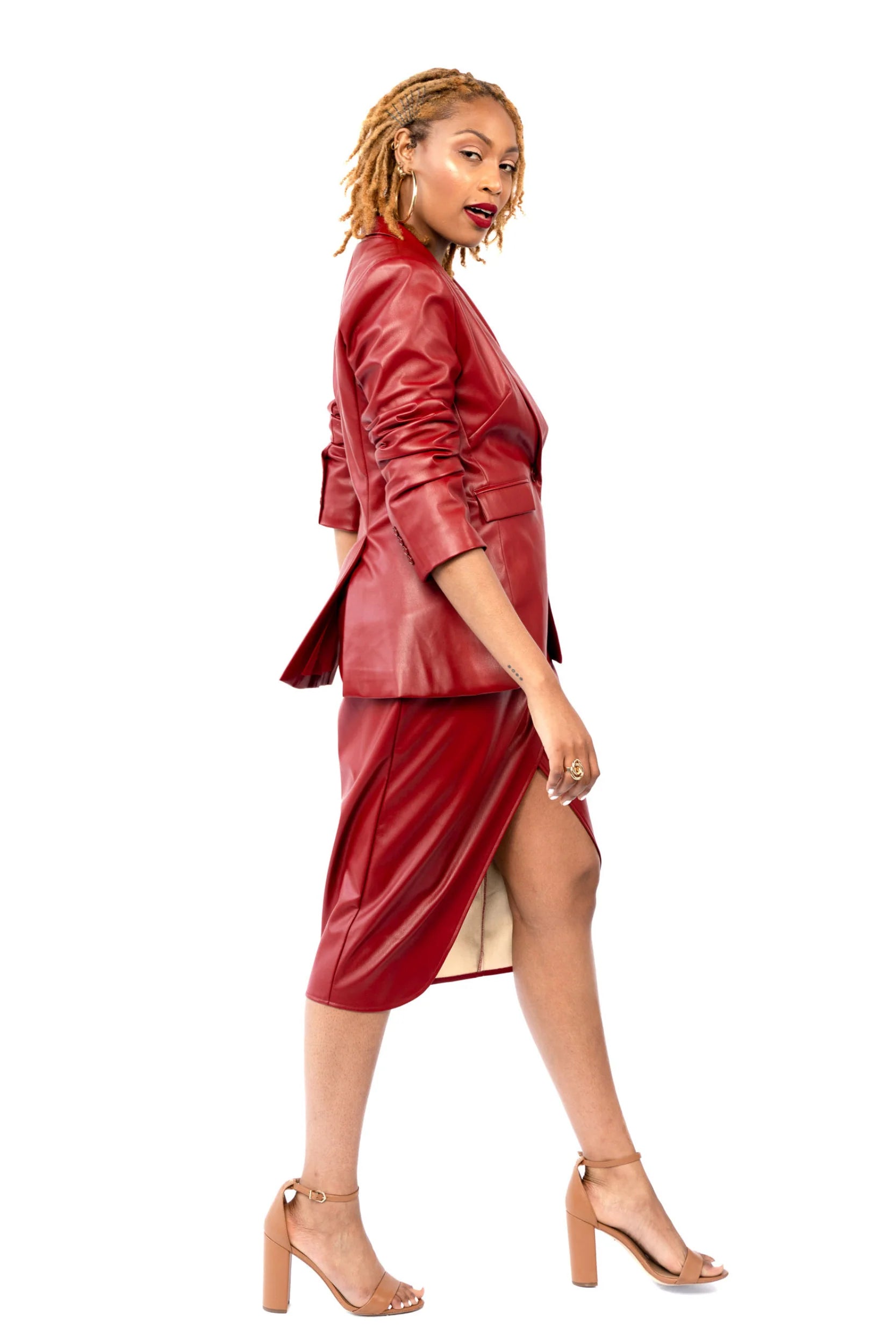 The Whitney Allysn Capsule Skirt is crafted in a smooth medium-weight vegan leather fabric. Offered in 2 lengths, the faux wrap pencil silhouette and 2” wide band snatch your waist creating a flattering drape across your hips. She’s armed with an invisible back zipper. Style the Capsule Skirt with the Capsule Blazer for a complete boss lady look.