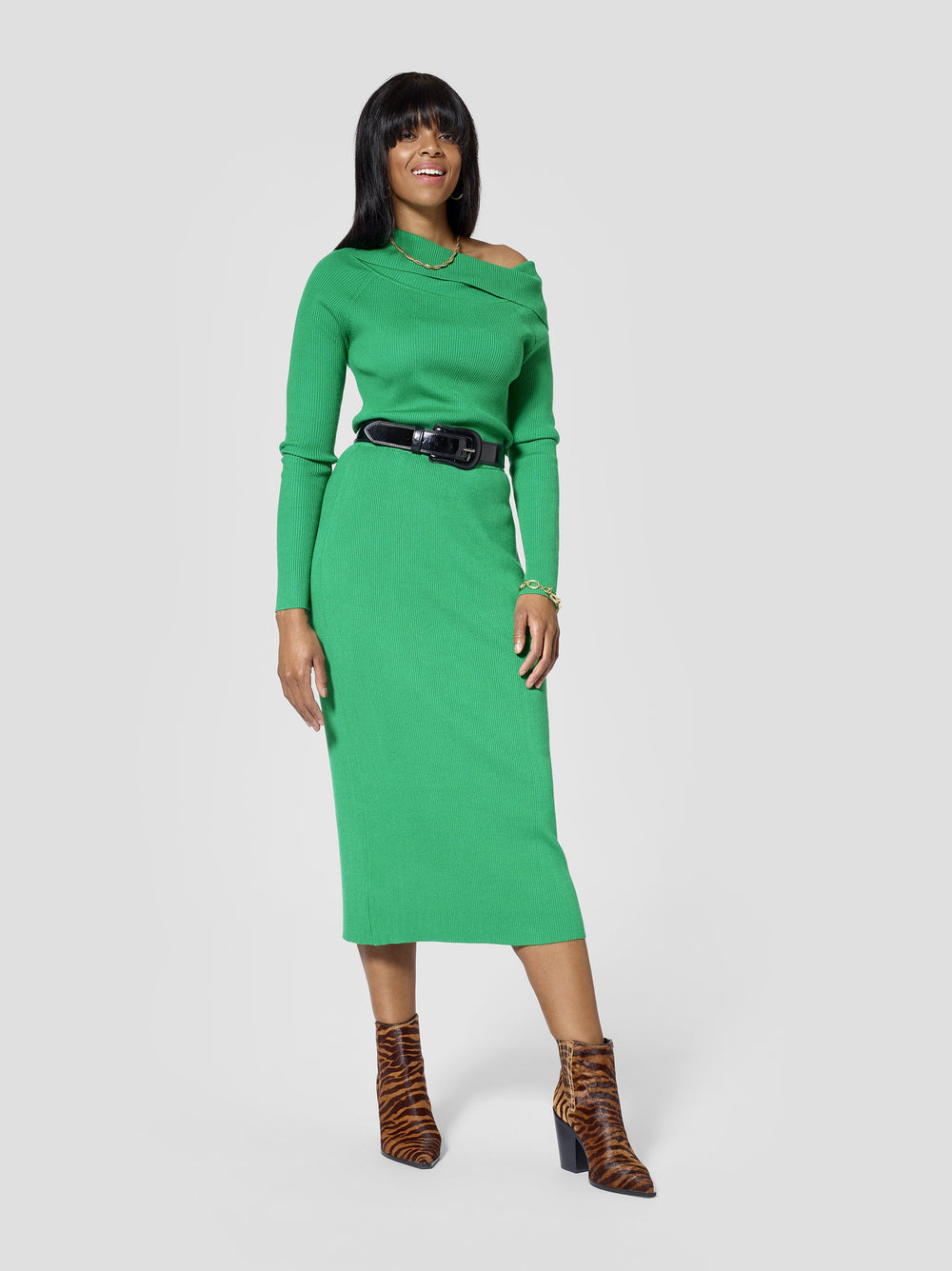 Add a punch to your wardrobe with this stunning off-shoulder tall sweater top. Crafted in a stretch fabrication with a fine rib knit, the folded neckline exposes both shoulders for a flattering and subtly sexy silhouette. The bold color makes this the ideal piece to elevate a pair of classic jeans, although we like this best paired with our Knit Pencil Skirt for a look that is sure to turn heads.